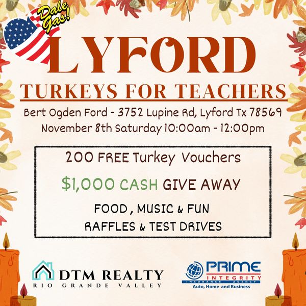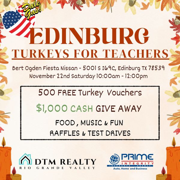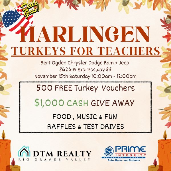 For all our Hidalgo County Teachers & surrounding, reserve your spot below. Over 500 FREE turkeys being handed out, plus lunch, raffles and $1000 CASH GIVEAWAY.
